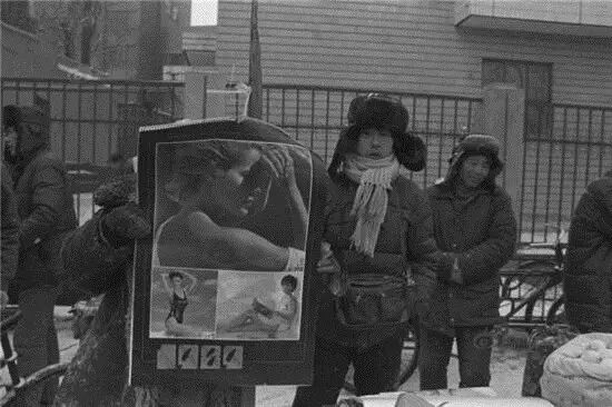 1989年春节前,小贩在江哈尔滨街头叫卖泳装挂历