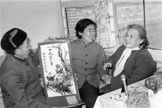 时任全国妇联主席康克清(右)1982年大年初一看望北京市四季青公社西山果树三队社员、全国“三八”红旗手王凤芹时,向她和她的丈夫赠送挂历。