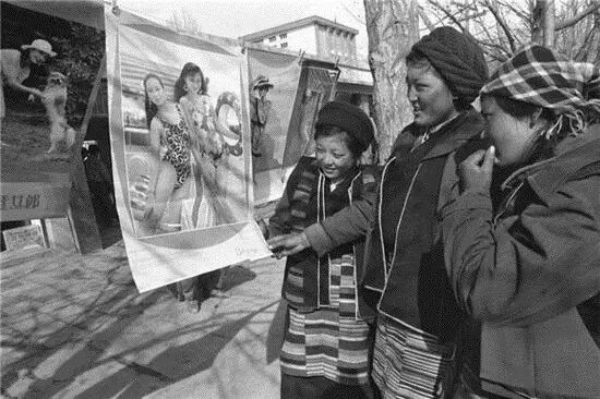 1993年藏历水鸡年(公历2月22日)前,西藏山南地区泽当镇,几位来自曲松县农村的藏族姑娘被挂历摊上的泳装美女所吸引。