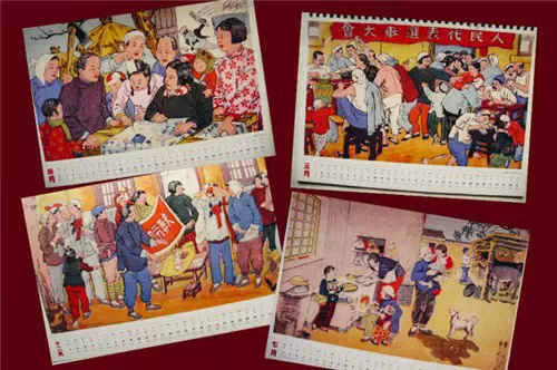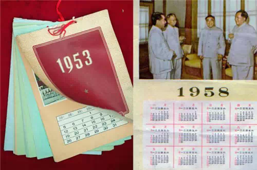 1950年代,建国伊始,代表选举、人民公社、劳动模范、文化学习等内容便出现在挂历上。同时,挂历也担负着外宣和外交功能。例如1954年,中央委派上海市制作了5000本挂历,印有黄果树瀑布、漓江等风光,送给与中国有贸易往来的国际友人。